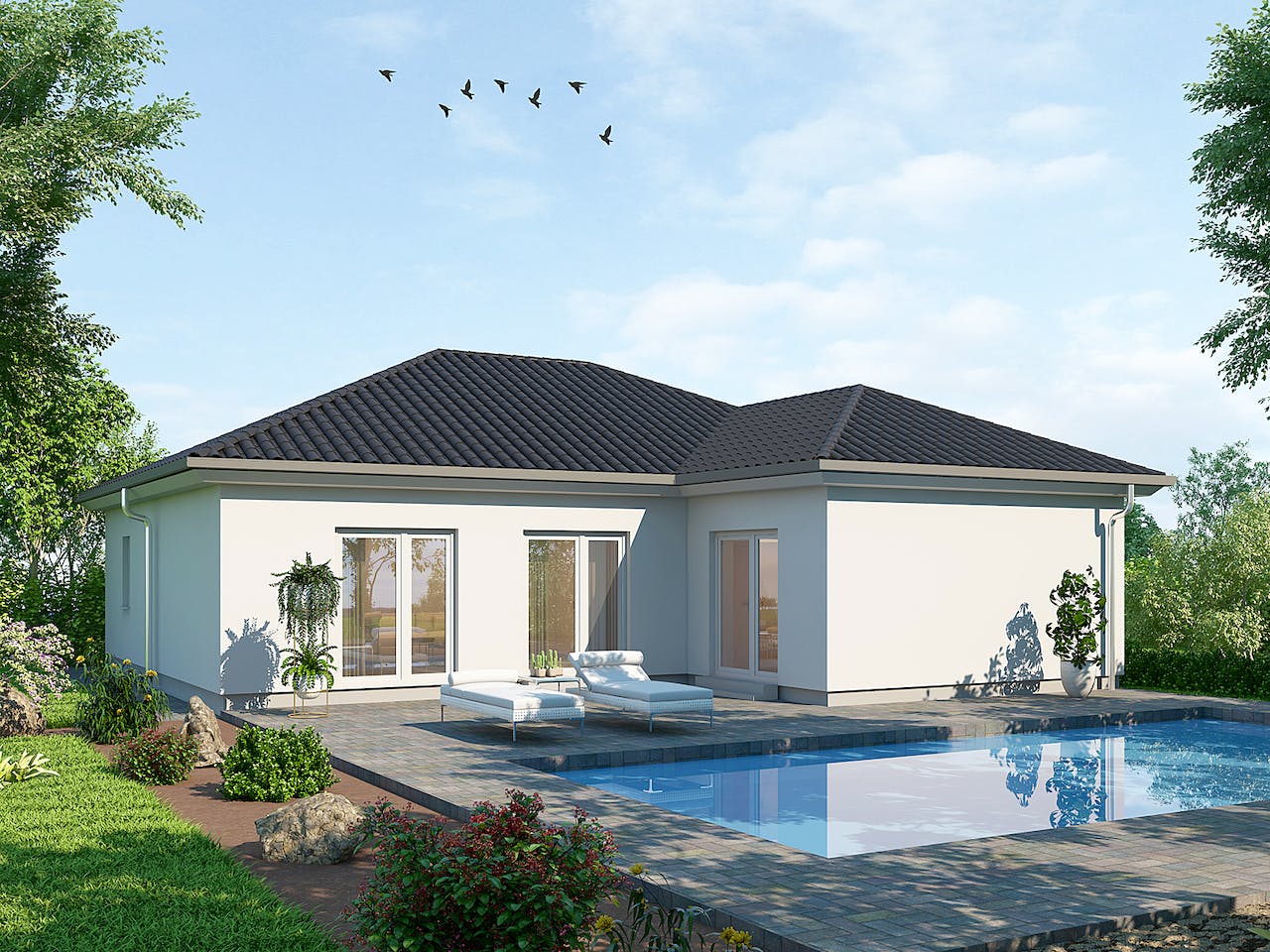 Die charakteristische L-Form des Bungalows schafft einen geschützten Winkel, der sich ideal als private Terrassenfläche anbietet. Sowohl das Wohnzimmer als auch das Elternschlafzimmer haben direkten Zugang zu diesem Außenbereich. Das klassische Walmdach unterstreicht die elegante Optik und sorgt für eine zeitlose Architektur, die sich harmonisch in verschiedene Wohngebiete einfügt und viel Gestaltungsfreiheit lässt.