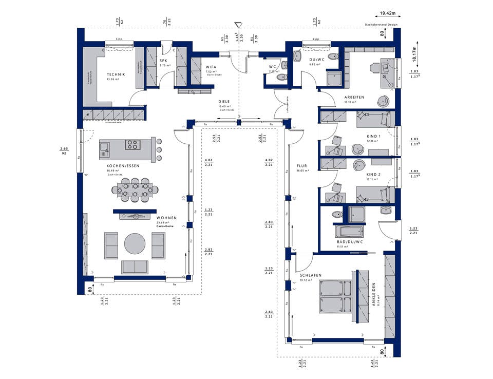 Passen Sie den Grundriss an Ihre persönlichen Bedürfnisse an und besprechen Sie Ihren individuellen Plan mit einem Bauberater des Anbieters.