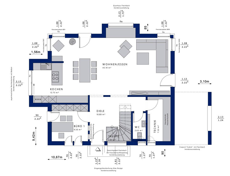Passen Sie den Grundriss an Ihre persönlichen Bedürfnisse an und besprechen Sie Ihren individuellen Plan mit einem Bauberater des Anbieters.
