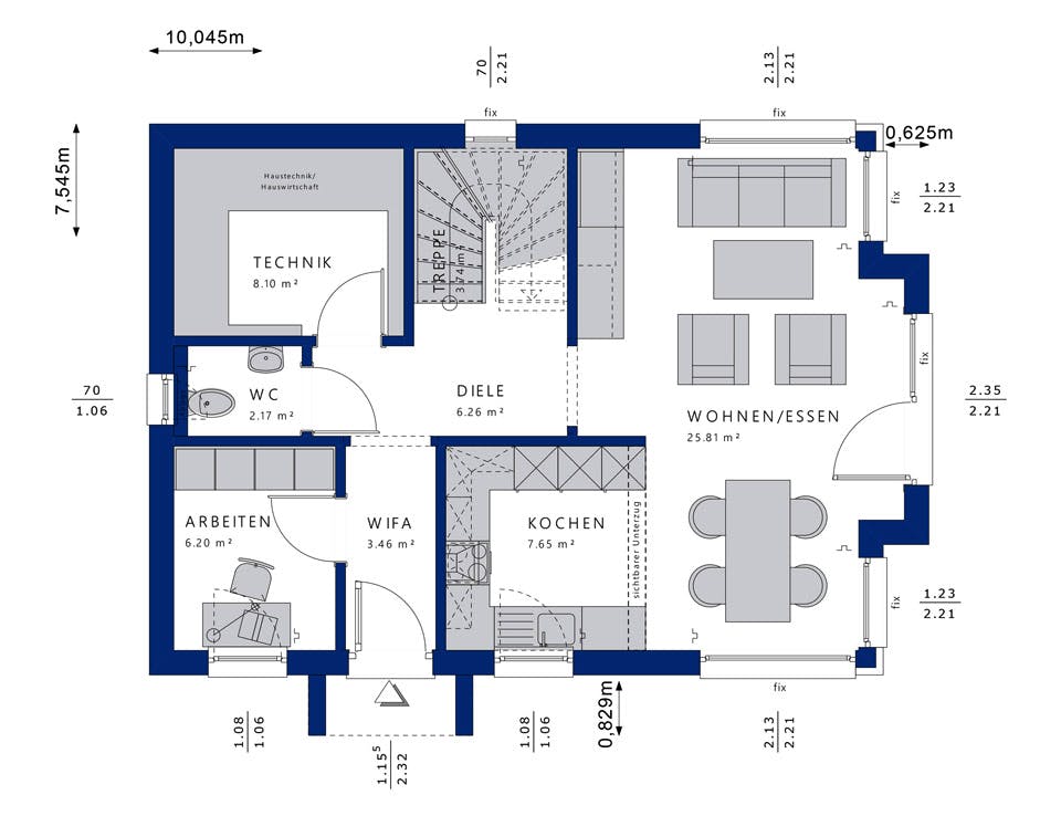 Passen Sie den Grundriss an Ihre persönlichen Bedürfnisse an und besprechen Sie Ihren individuellen Plan mit einem Bauberater des Anbieters.