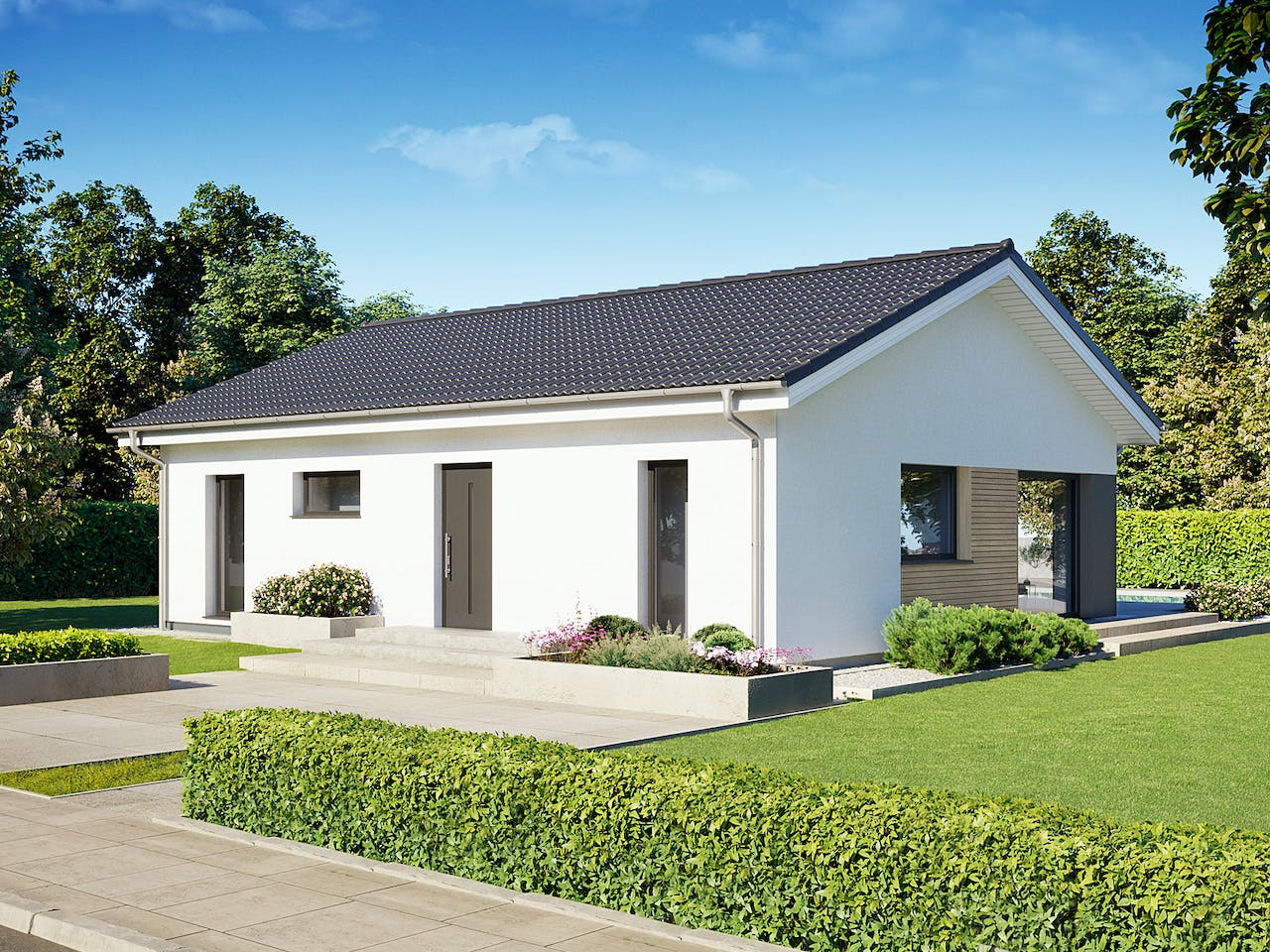 Das Haus besticht durch seine klassische Architektur mit einem zeitlosen Satteldach. Besonders hervorzuheben sind die großzügigen Fensterfronten, die den Wohn- und Essbereich optisch vergrößern und für viel natürliches Licht sorgen. Dieser Stil kombiniert eine traditionelle Außenansicht mit einem modernen, hellen Innenraumkonzept, das den verfügbaren Platz auf einer Ebene optimal und funktional ausnutzt.