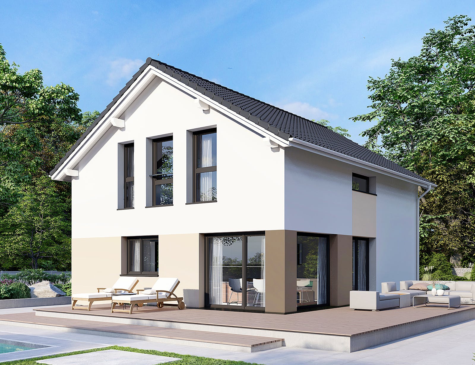 Das Satteldach liegt in Form eines Dreiecks auf dem Baukörper und schließt entweder mit seinem First parallel zu den beiden Giebeln ab oder es ragt noch über die Giebel hinaus. Satteldächer werden als Pfettendach oder als Sparrendach ausgebildet. Üblich sind Dachneigungen ab etwa 30˚ (flaches Satteldach) bis über 60˚ (altdeutsches Dach). Weit verbreitet sind Satteldächer mit etwa 38˚ bis 45˚ Neigung. Diese bieten genug Raum für einen Ausbau des Dachgeschosses.