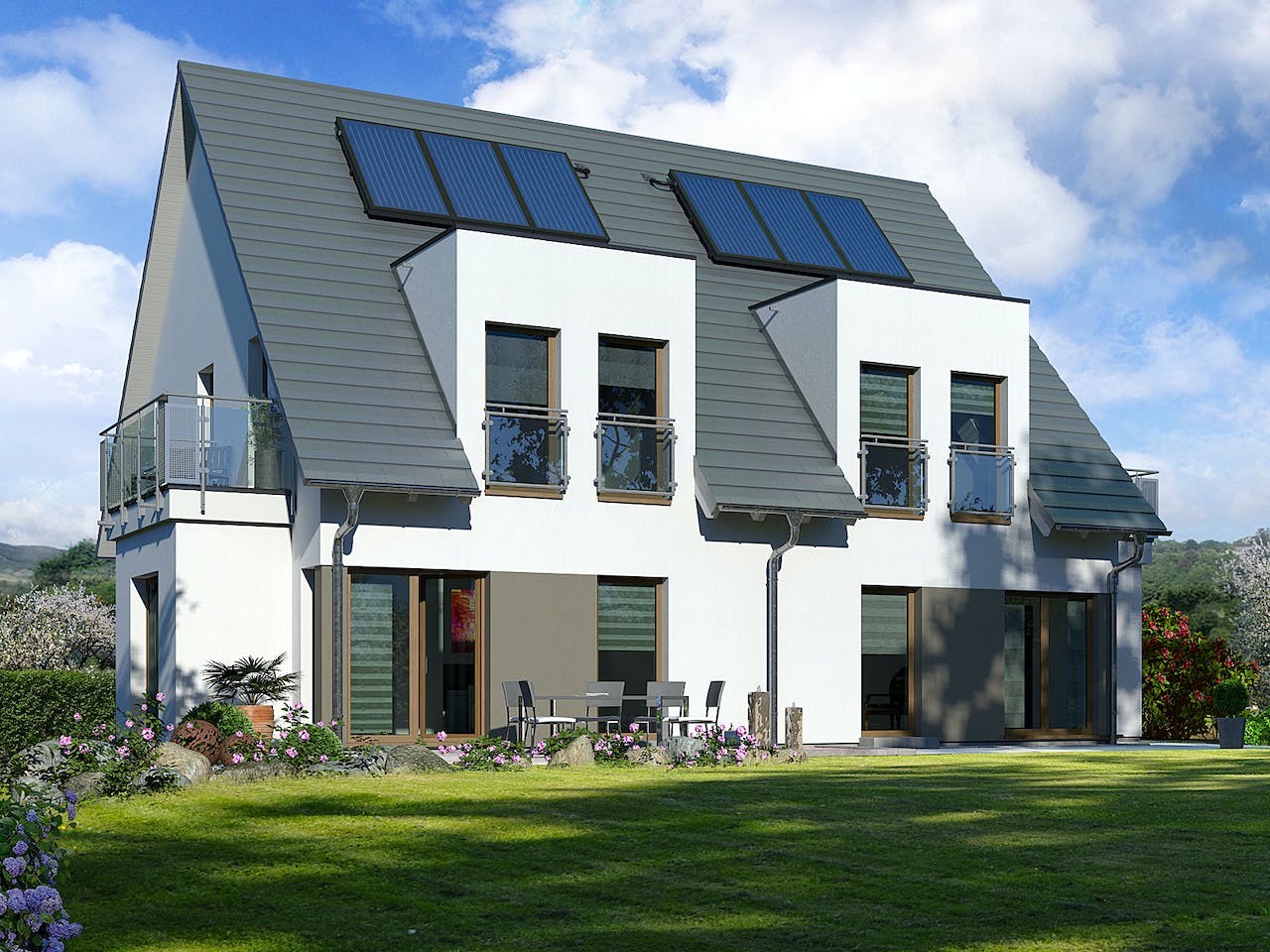 Für eine Haushälfte mit einer Grundfläche von etwa 72 m² empfehlen wir ein Grundstück ab circa 350 m². Darin sind 50 m² für Stellplätze sowie eine Gartenfläche von etwa 240 m² bereits eingeplant. So stellen wir sicher, dass Sie genügend Freiraum genießen und alle baurechtlichen Abstände für dieses Doppelhaus zuverlässig eingehalten werden.