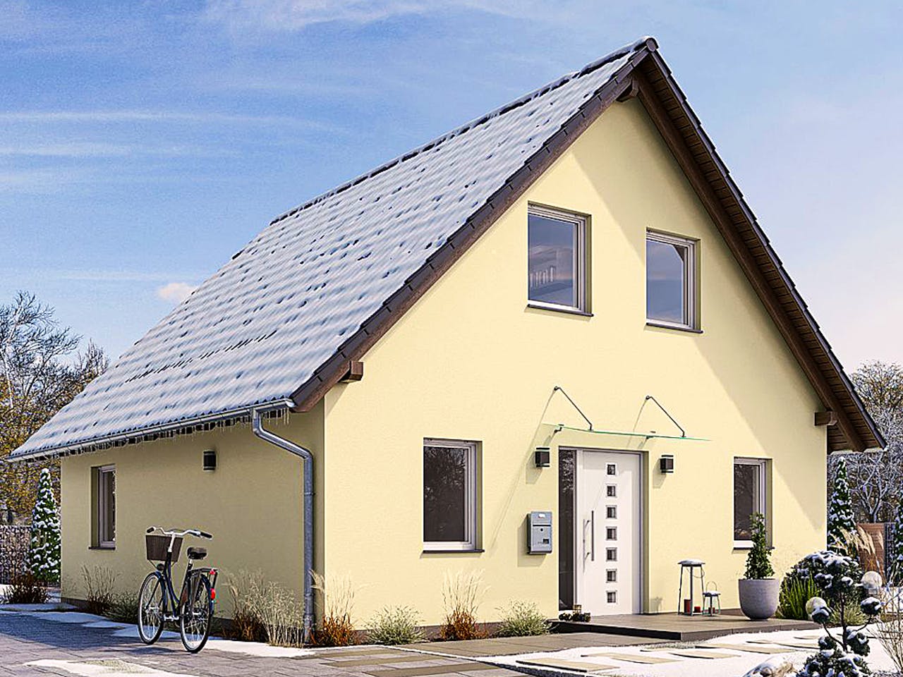 Dieses Modell ist ein klassisches Satteldachhaus mit einer Dachneigung von 45 Grad. Die Architektur überzeugt durch ihre zeitlose Form und die kompakte Bauweise auf anderthalb Etagen. Besonders hervorzuheben ist der hohe Energiestandard: Wir bieten Ihnen Optionen für ein Effizienzhaus 40 oder 55 an, was langfristig Ihre Heizkosten senkt und die Umwelt schont.