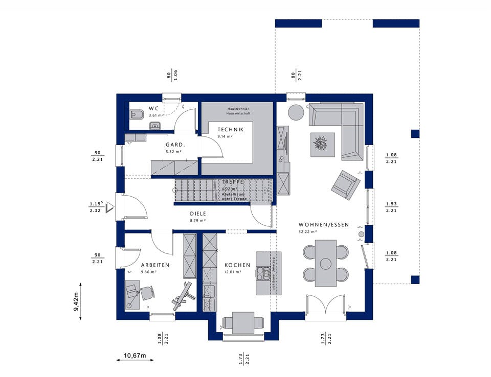 Passen Sie den Grundriss an Ihre persönlichen Bedürfnisse an und besprechen Sie Ihren individuellen Plan mit einem Bauberater des Anbieters.