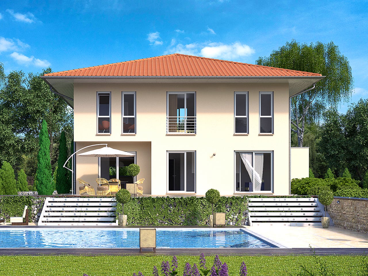 Die Stadtvilla Bremen ist mit einem klassischen Walmdach ausgestattet, das eine Dachneigung von 20 Grad aufweist. Diese Form verleiht dem Gebäude eine zeitlose Eleganz und sorgt für volle Raumhöhen im Obergeschoss ohne störende Schrägen. Kombiniert mit dem überdachten Eingangsbereich und dem Balkon entsteht ein harmonisches, modernes Erscheinungsbild, das funktionalen Komfort und Ästhetik perfekt vereint.