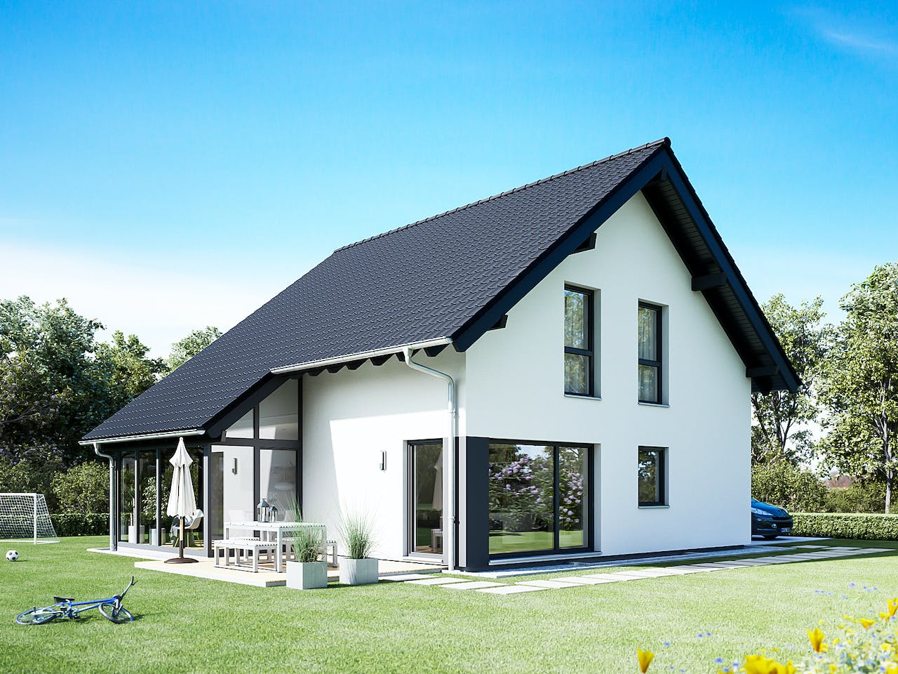 Das VIO 200 kennzeichnet sich durch ein Satteldach mit einer Dachneigung von 38°, einem Kniestock von 1,30 Metern und einem wohnlichen Wintergarten aus.