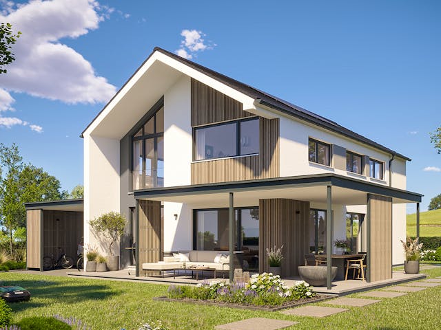 Haas Fertigbau bietet Ihnen volle Flexibilität bei der Gestaltung. Sie können das Vivo 159 als Ausbauhaus wählen, um durch Eigenleistung Kosten zu sparen, oder sich für die entspannte schlüsselfertige Variante entscheiden. Wir beraten Sie gerne dazu, welche Stufe am besten zu Ihrem Zeitplan und Ihren handwerklichen Fähigkeiten passt.