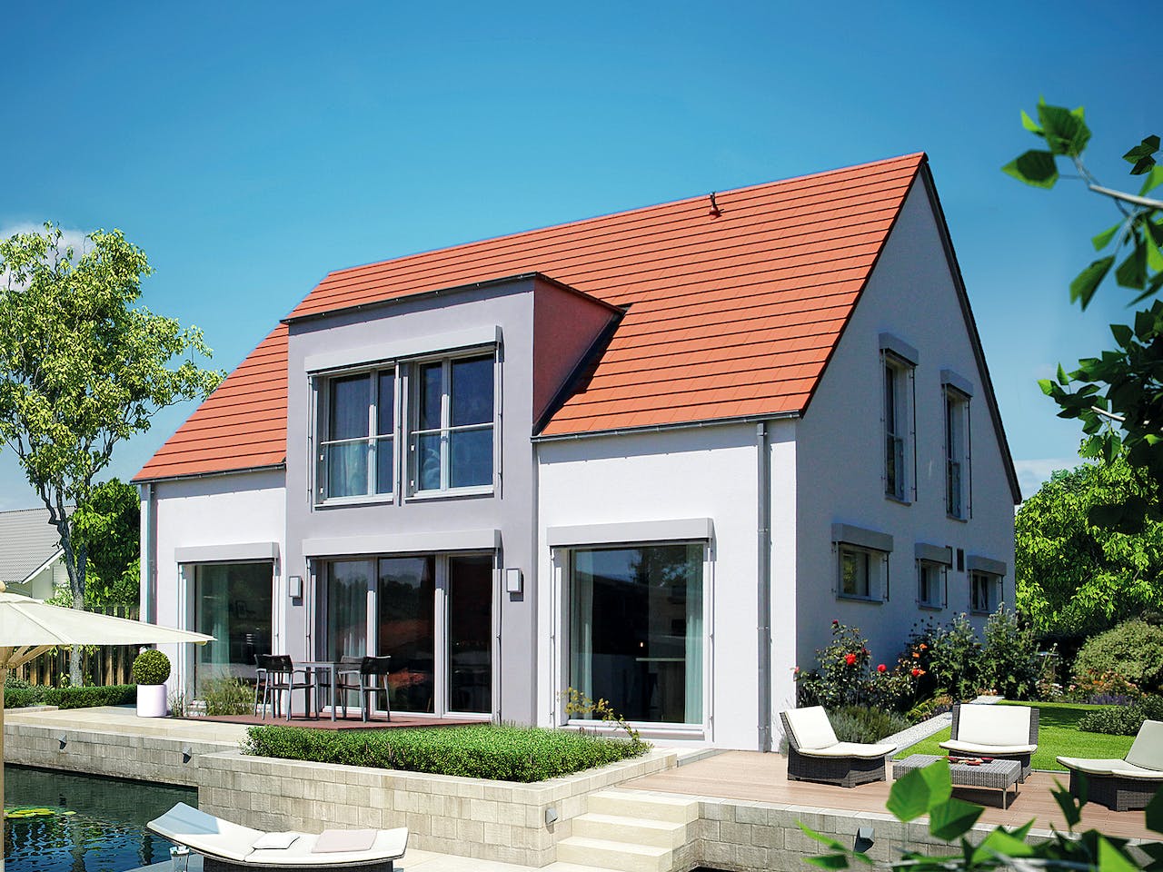Das Design besticht durch ein klassisches Satteldach und eine durchdachte Raumaufteilung auf 175 m². Im Erdgeschoss erwartet Sie ein großzügiger, offener Wohnbereich als Familienmittelpunkt. Das Dachgeschoss punktet mit sieben Zimmern, darunter zwei flexibel nutzbare Kinderzimmer und ein Wellnessbad. Diese Architektur kombiniert traditionelle Ästhetik perfekt mit modernem, funktionalem Wohnkomfort für große Familien.