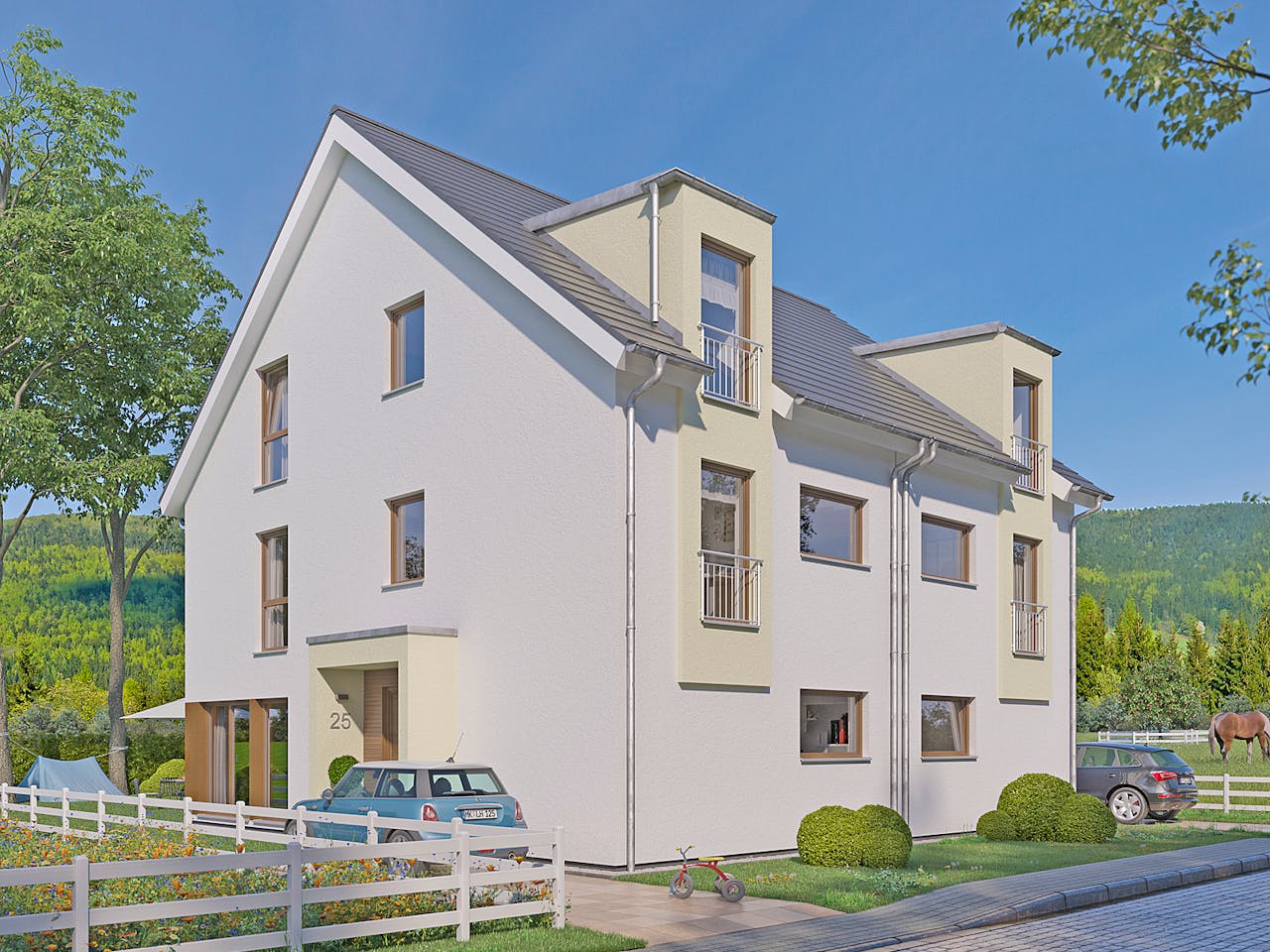 Das Solution 125 XL V4 ist ein Doppelhaus mit Extragröße. Über drei Stockwerke verteilen sich alle deine Wohnräume. 3 Kinderzimmer passen so easy in dein Haus. Durch die zwei Giebel im Dach ist deine Fassade interessant gestaltet, zudem hast du noch Platz und noch mehr Licht in deinem Badezimmer im Dachgeschoss.