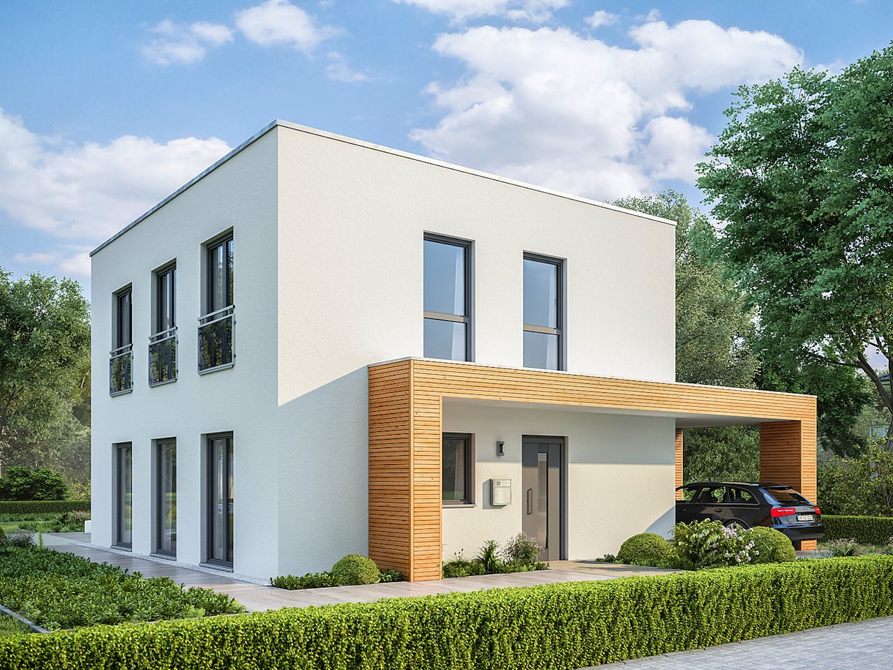 Das Haus besticht durch sein modernes Cubushaus-Design mit einem Flachdach, das den klaren Bauhaus-Stil unterstreicht. Mit sieben Zimmern auf zwei Etagen bietet es eine außergewöhnliche Raumvielfalt auf kompakter Fläche. Besonders flexibel: Der Grundriss ist so konzipiert, dass er alternativ auch mit einem Sattel- oder Walmdach realisiert werden kann, um Ihren persönlichen Geschmack perfekt zu treffen.
