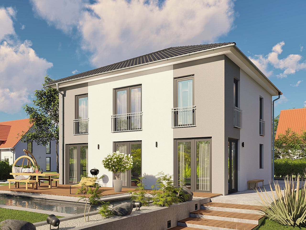 Dieses Haus ist als klassische Stadtvilla mit zwei Vollgeschossen konzipiert. Durch das elegante Walmdach entstehen im Obergeschoss keine Dachschrägen, was Ihnen maximale Stellfläche für Möbel bietet. Das Design wirkt zeitlos und anspruchsvoll. Wir schätzen besonders die Flexibilität der fünf Zimmer, die sich ideal an die Bedürfnisse einer modernen Familie anpassen lassen.