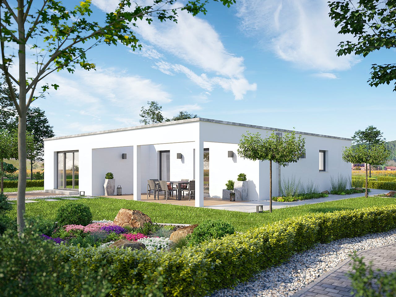Das Flachdach verleiht dem Bungalow eine moderne Bauhaus-Optik und ermöglicht eine optimale Raumnutzung ohne Dachschrägen. Besonders markant ist die optionale visuelle Einbindung der Terrasse mittels Luftbalken. Wir schätzen an dieser Architektur die puristische Linienführung, die perfekt zu einem zeitgemäßen Lebensstil passt. So entsteht auf der quadratischen Grundfläche ein helles Wohnambiente mit fließenden Übergängen zum Außenbereich.