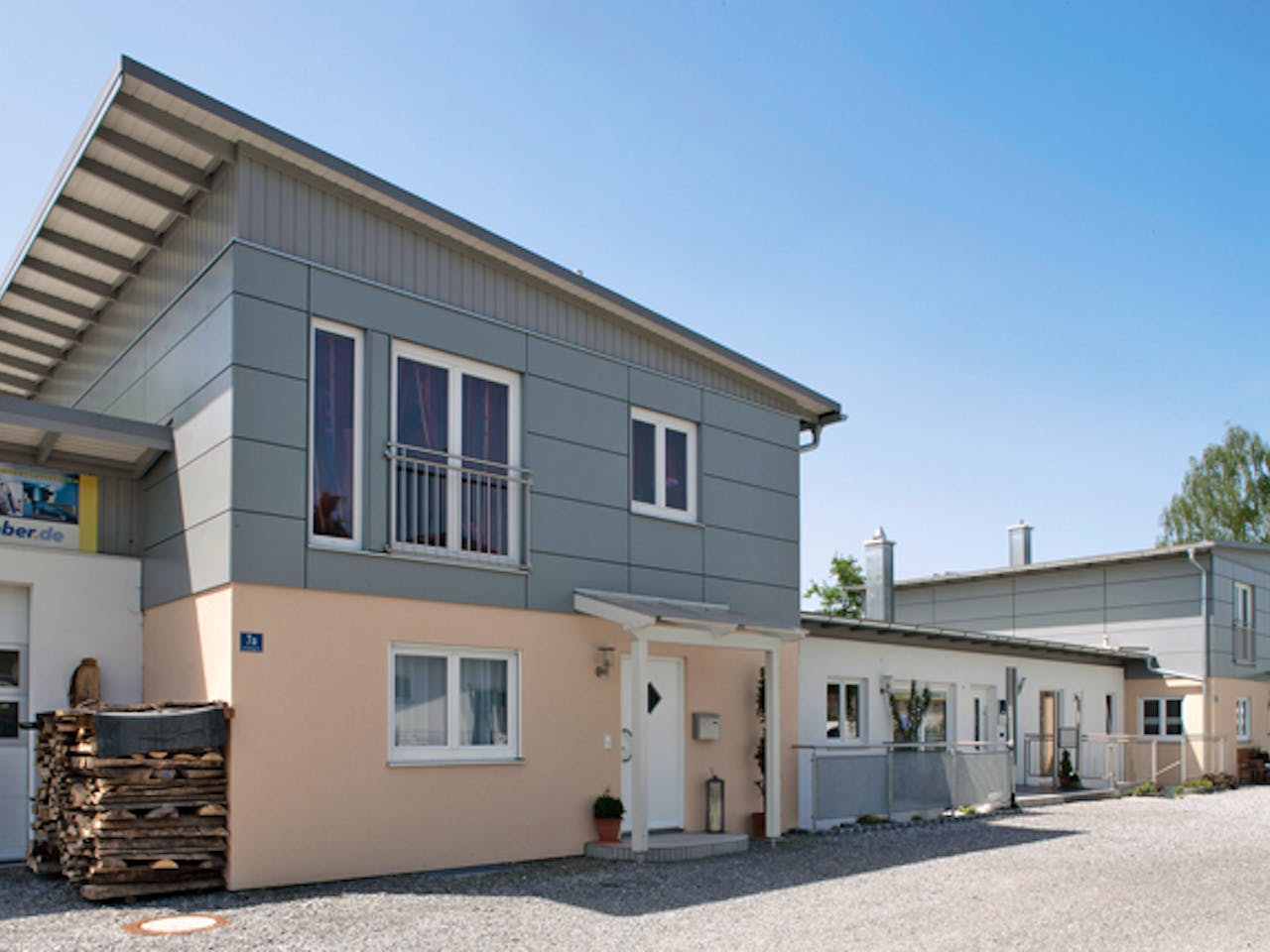 Im Oberbayerischen erbaut wurden diese zwei Einfamilienhäuser mit gewerblichen Anbauten, die Wohnen und Arbeiten miteinander vereinen. Beide Häuser plus Anbauten gleichen sich wie ein Zwilling dem anderen: Der Komplex verbindet zwei Wohnhäuser mit jeweils etwa 122 qm Fläche durch zwei Anbauten mit jeweils 52 qm Fläche. In beiden Wohngebäuden bildet ein offener Wohn- und Essbereich mit angrenzender Küche den Mittelpunkt. Im Obergeschoss sind die Schlafzimmer der Eltern und jeweils zwei Kinderzimmer sowie das Familienbad angeordnet worden.