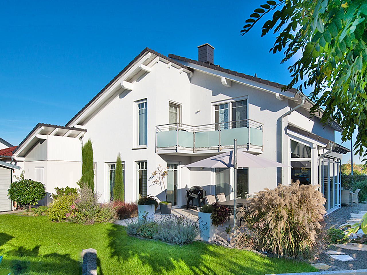 Die attraktive Außenwirkung des Hauses wird durch eine dezente Sprosseneinteilung der weißgerahmten Fenster, dem Glas-Panorama-Erker und dem Carport / Garagenelement bestimmt.