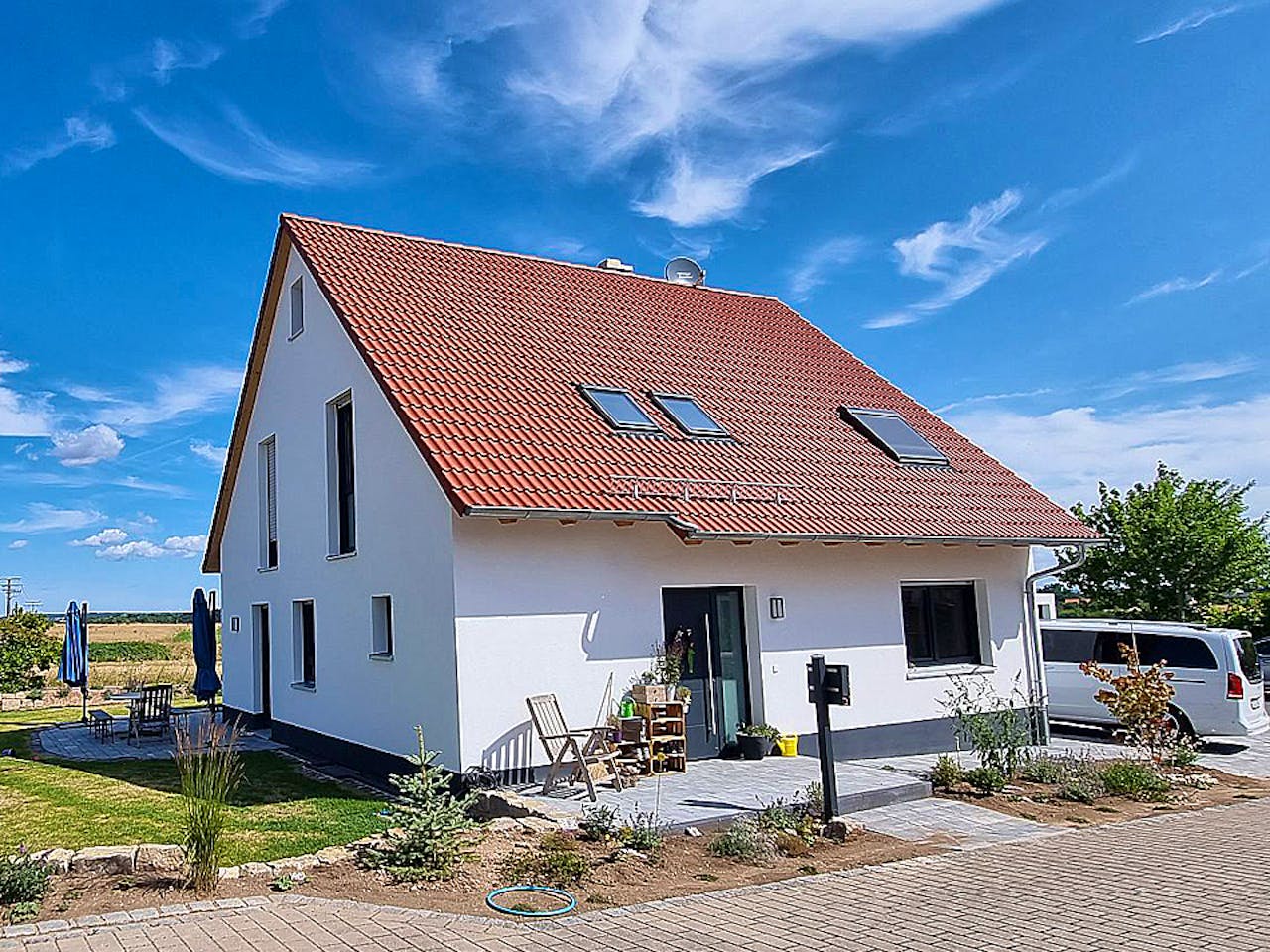 Das Haus Silva besticht durch ein klassisches Satteldach mit einer Neigung von 45 Grad. Diese Konstruktion ermöglicht eine optimale Raumausnutzung im Obergeschoss und verleiht dem Gebäude seinen zeitlosen Charakter. Die massive Bauweise sorgt zudem für hervorragenden Schallschutz und ein angenehmes Raumklima. Wir unterstützen Sie dabei, die Fassadengestaltung individuell an Ihre persönlichen Vorstellungen anzupassen.