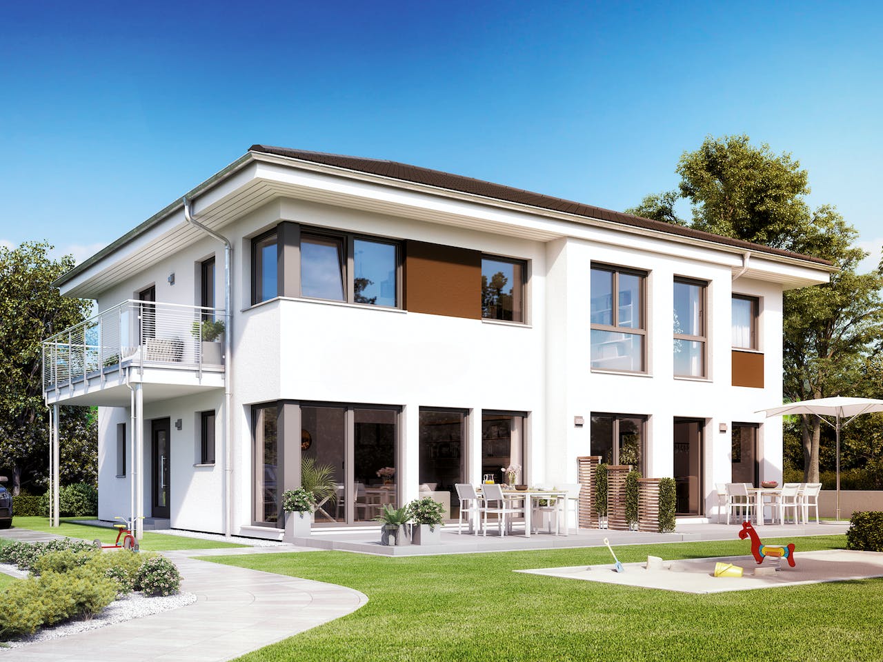 Für dieses Haus mit einer Grundfläche von rund 139 m² empfehlen wir ein Grundstück von mindestens 550 m². Diese Kalkulation berücksichtigt 50 m² für Stellplätze sowie ausreichend Gartenfläche für Erholung und Abstandsflächen. So bleibt trotz der stattlichen Hausgröße genügend Freiraum im Außenbereich, damit sich alle Bewohner des Zweifamilienhauses auf dem Anwesen rundum wohlfühlen können.
