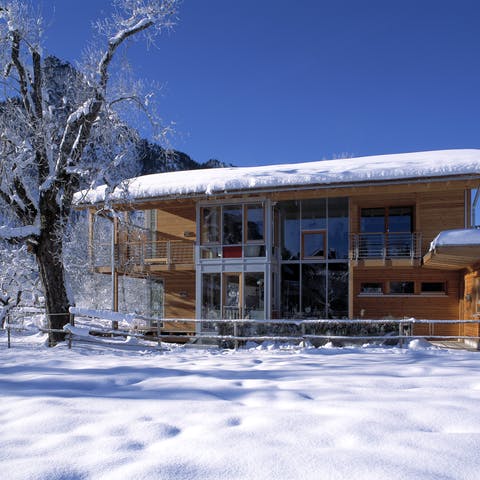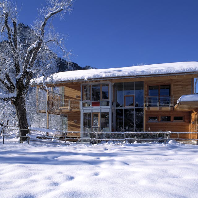 - Bei der Dachform auf ein Flachdach verzichten. Besser eignen sich Dächer mit einem steileren Neigungswinkel, damit Schneemassen leichter abrutschen können. Dafür kommen am ehesten Sattel-, Walm- und Pultdächer in Frage.